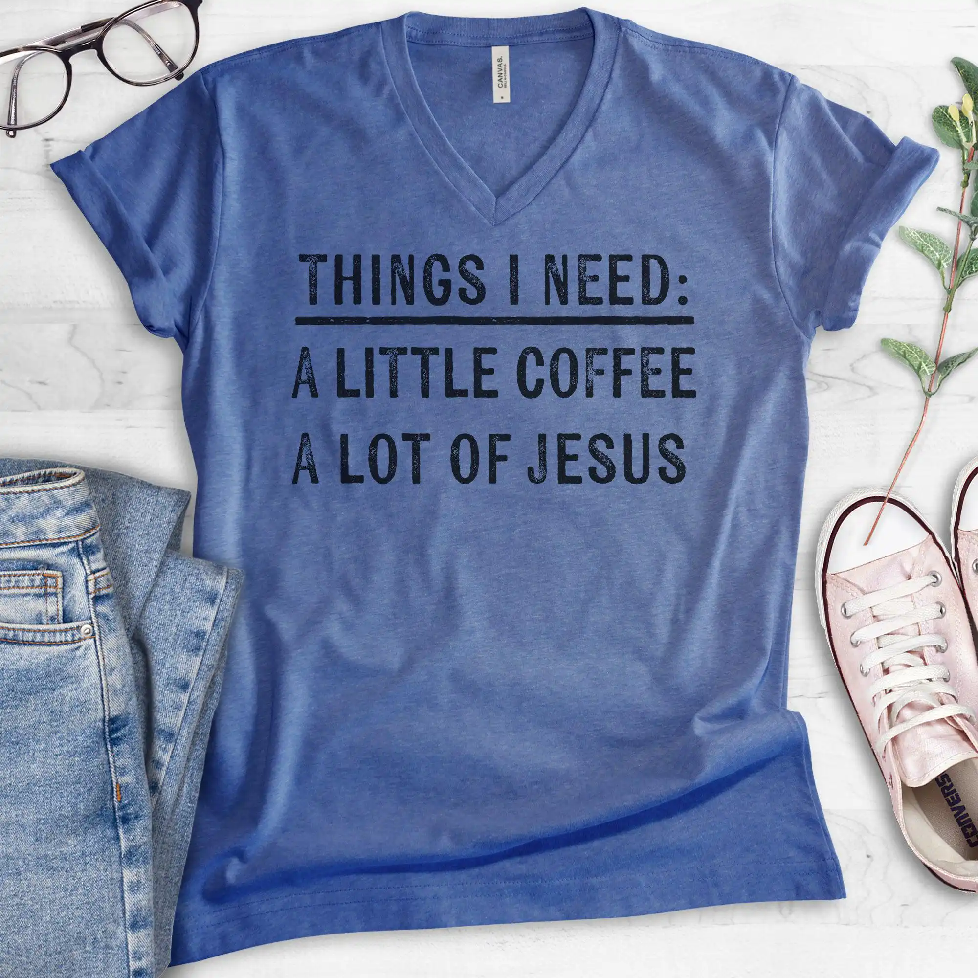 Introducing the Things I Need: A Little Coffee A Lot Of Jesus V-Neck T-shirt, Unisex Women’s, Religious Christian Faith Tee! This stylish t-shirt perfectly blends faith and fashion, making it an essential addition to your wardrobe. Whether you’re sipping your morning coffee or heading out for a casual day, this tee speaks to your soul and style.