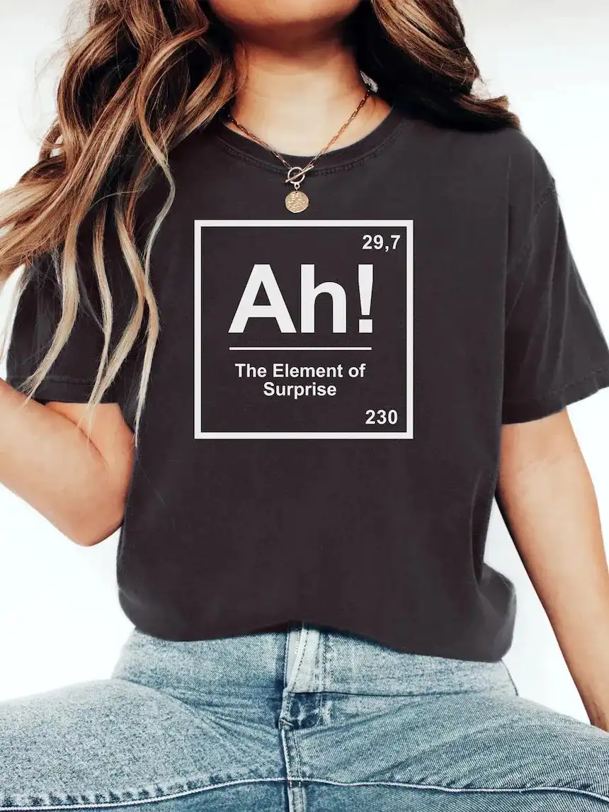 In short, this Ah! The Element of Surprise Shirt connects a classic chemistry gag to a present-day meme sensibility. It gives people who enjoy STEM humor a simple, on-topic way to show it. If you search for a science joke tee that reads like a meme and still lands in academic circles, this shirt delivers that exact blend of old pun and modern tone.