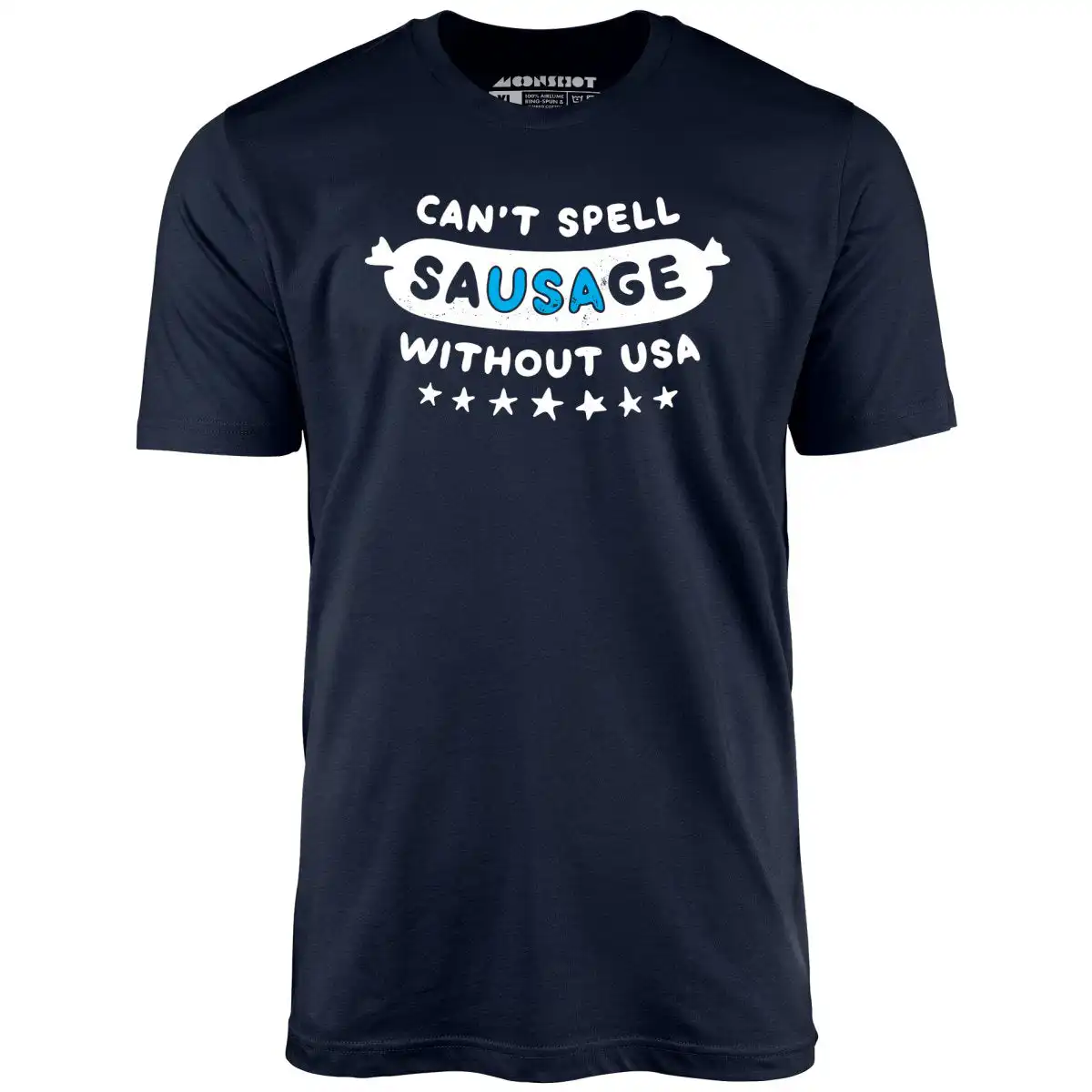 The design features distressed white block text that reads “CAN’T SPELL” above a whimsical sausage-shaped banner showcasing “SAUSAGE.” The letters “USA” are brilliantly emphasized in bright blue, making it impossible to miss. Below the banner, the phrase “WITHOUT USA” complements the playful graphic, followed by six white stars, symbolizing unity and pride in American culture.