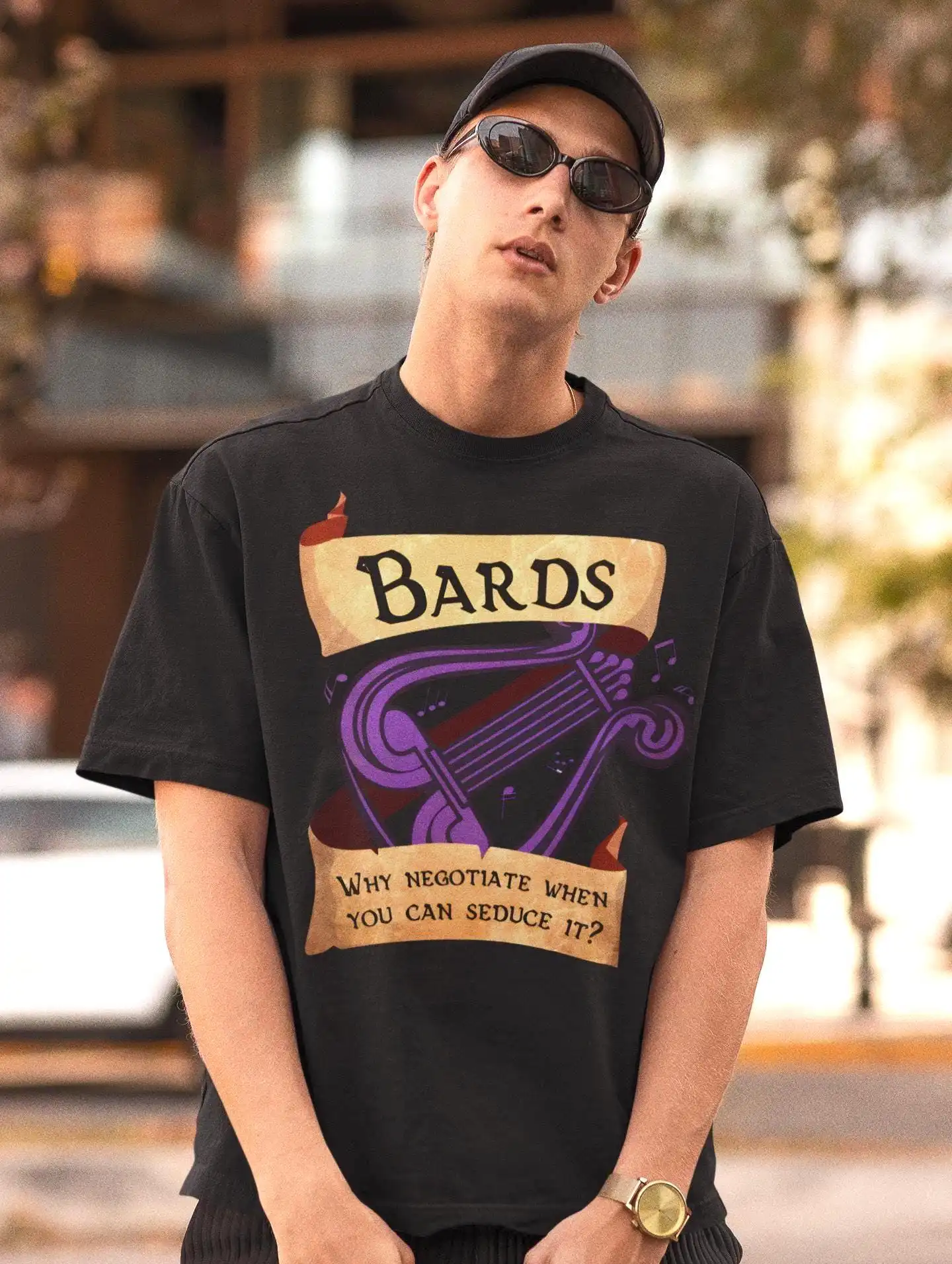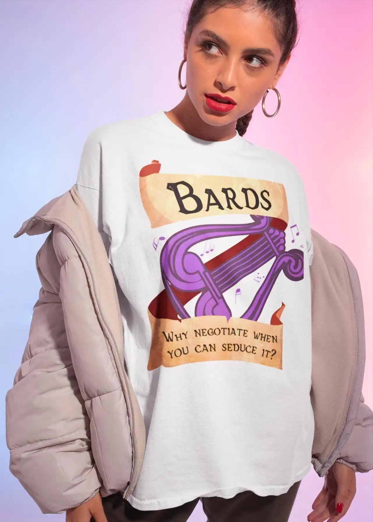 Dungeons and Dragons has officially crossed into high-fashion territory. Consequently, the Bard — the charismatic, spell-singing storyteller of every campaign — has become an icon. Moreover, this design captures that archetype with editorial precision. It is bold. It is layered. It is unmistakably relevant.
