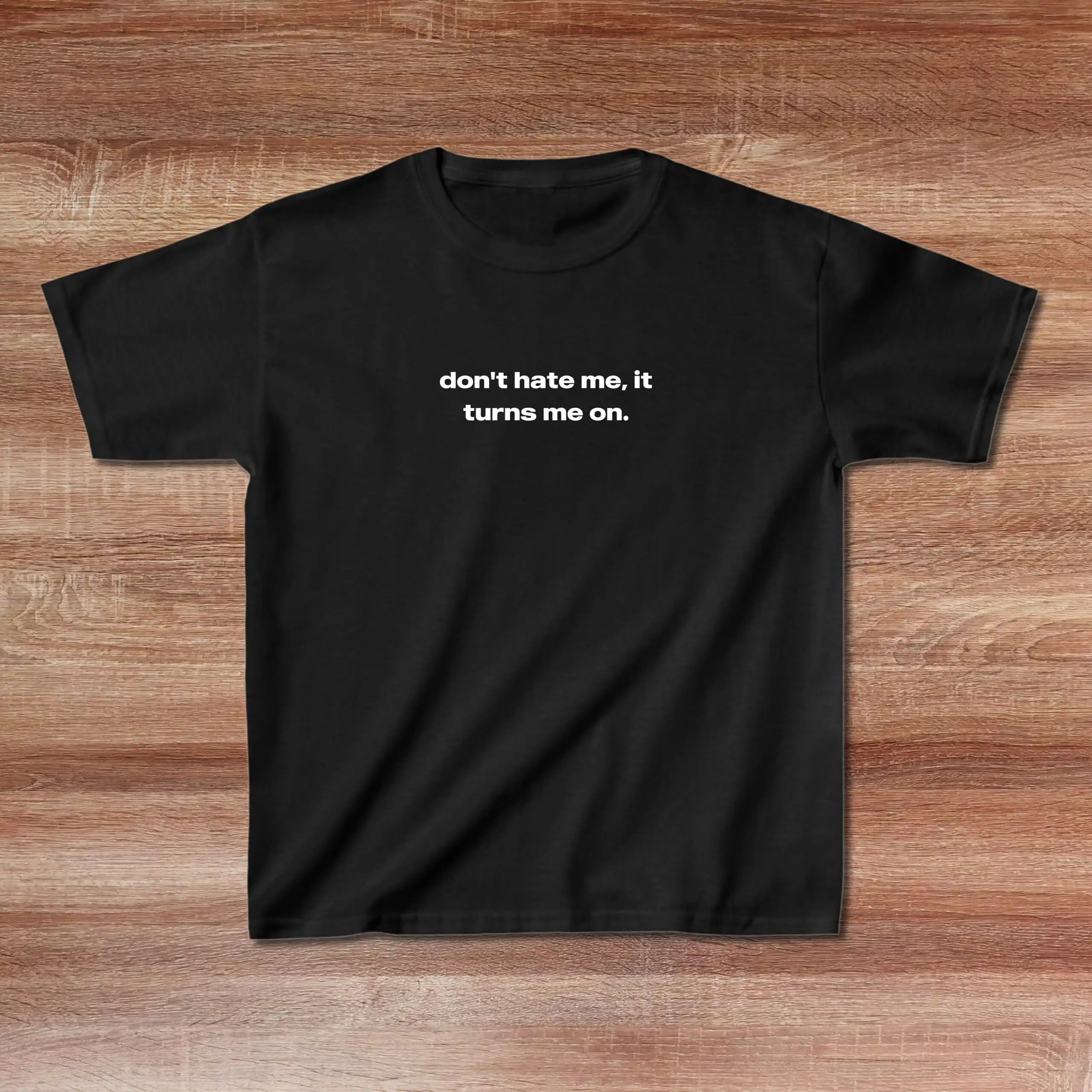 Don’t Hate Me, It Turns Me On Baby Tee – Retro Y2K Humor Shirt