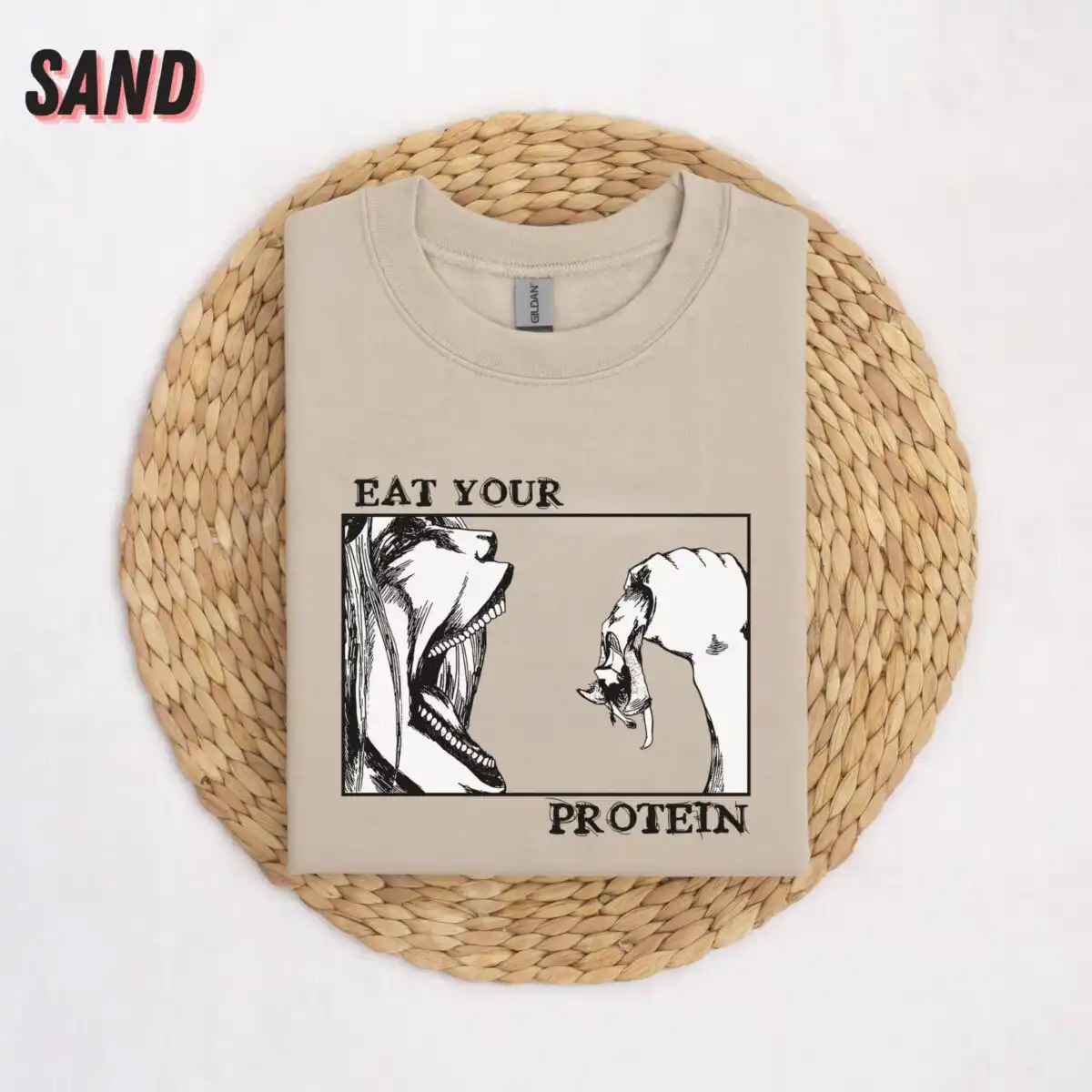 Embrace the spirit of the Titans while staying stylish and comfortable. Whether you’re lifting, lounging, or catching up on your favorite anime series, the Eat Your Protein Anime Shirt is the perfect way to bring fun and flair to your daily routine.