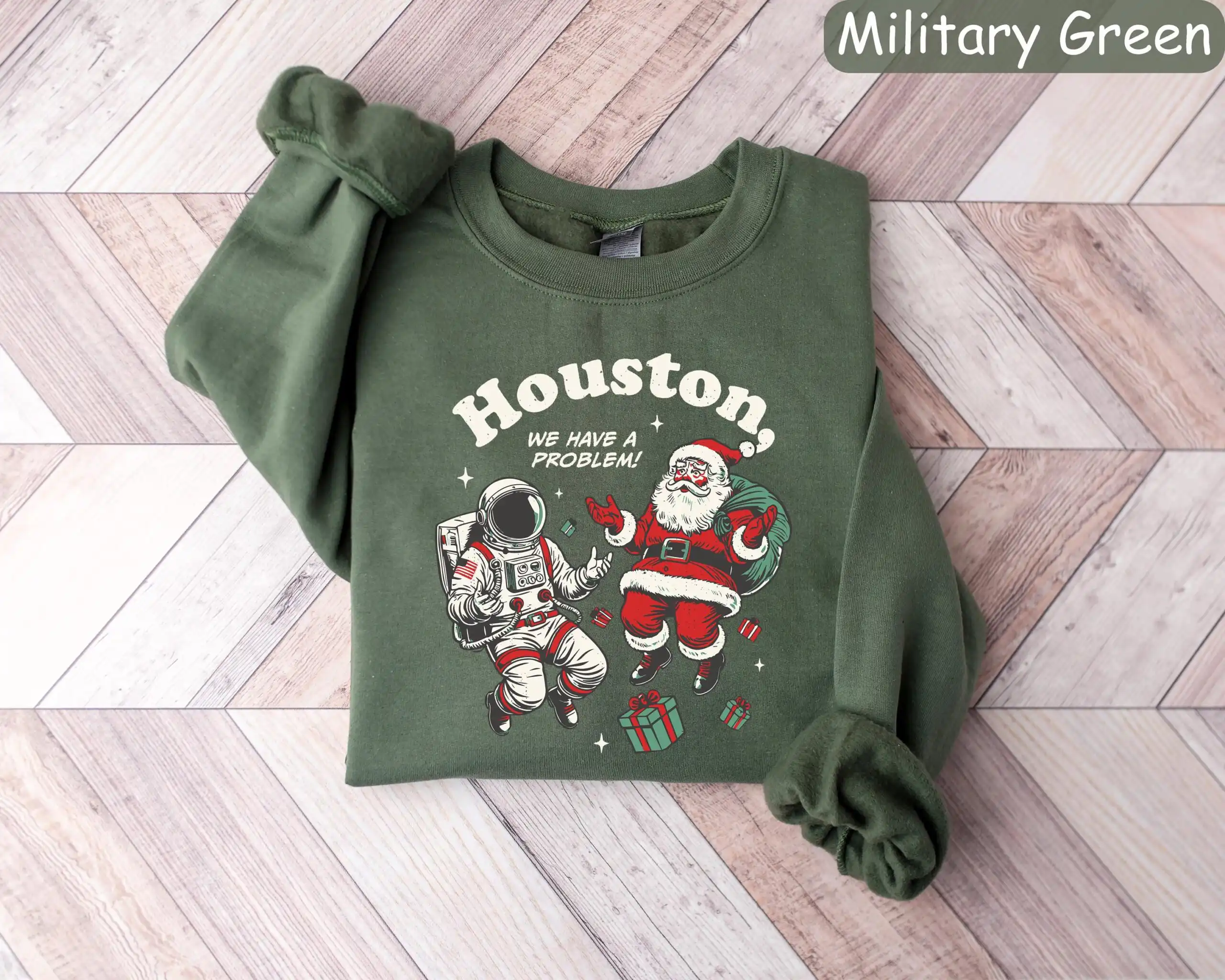 This unique sweatshirt features a whimsical design of Santa in an astronaut suit, blending the magic of Christmas with the excitement of space travel. Whether you’re gathering with friends or lounging at home, the vibrant graphic is sure to spark conversations and smiles. The lighthearted phrase “Houston, We Have a Problem” adds a fun twist to traditional holiday gear, making it a standout piece.