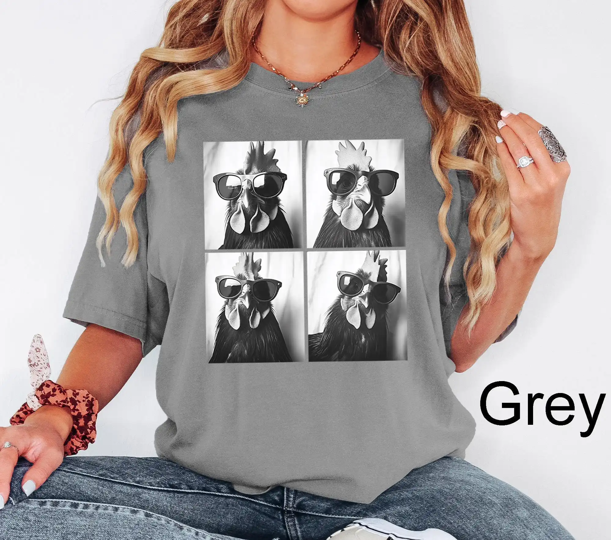 - Unique graphic featuring a rooster with sunglasses that adds a fun twist to your outfit.