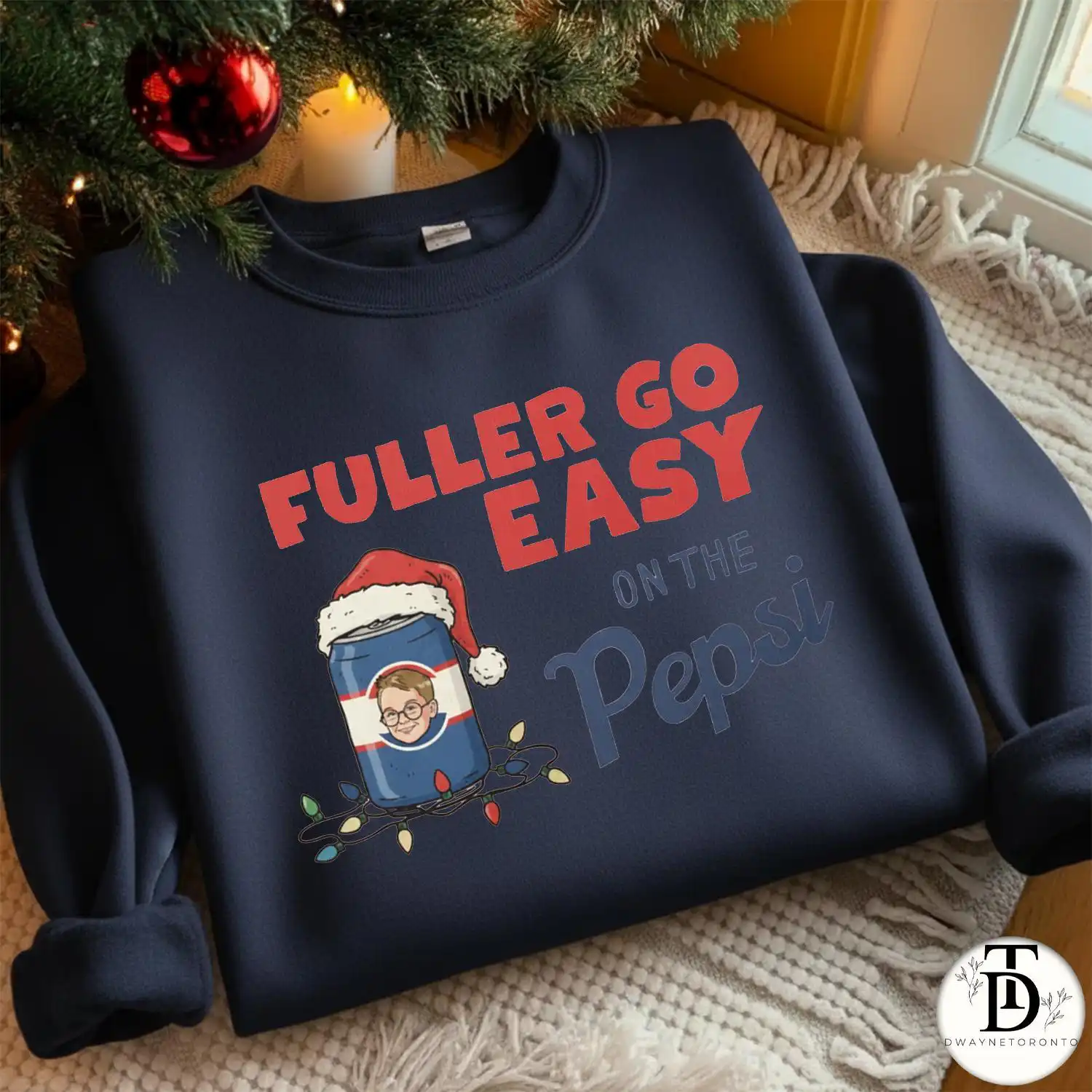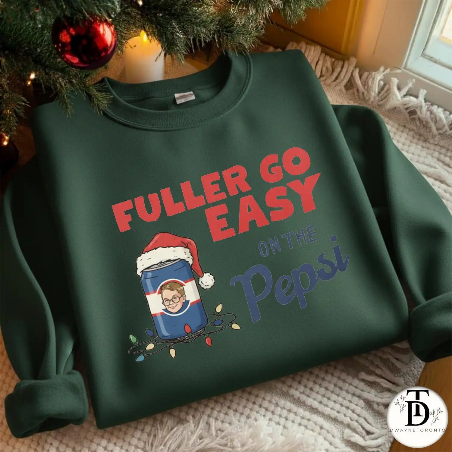 Get ready to spread some holiday cheer with the Fuller Go Easy on the Soda Christmas Sweatshirt! This Funny Home Alone Movie Shirt brings back all the nostalgia of the 90s, featuring the iconic line from the beloved film. Perfect for festive gatherings, movie nights, or casual outings, this retro xmas movie shirt is a must-have for fans of the classic holiday flick.