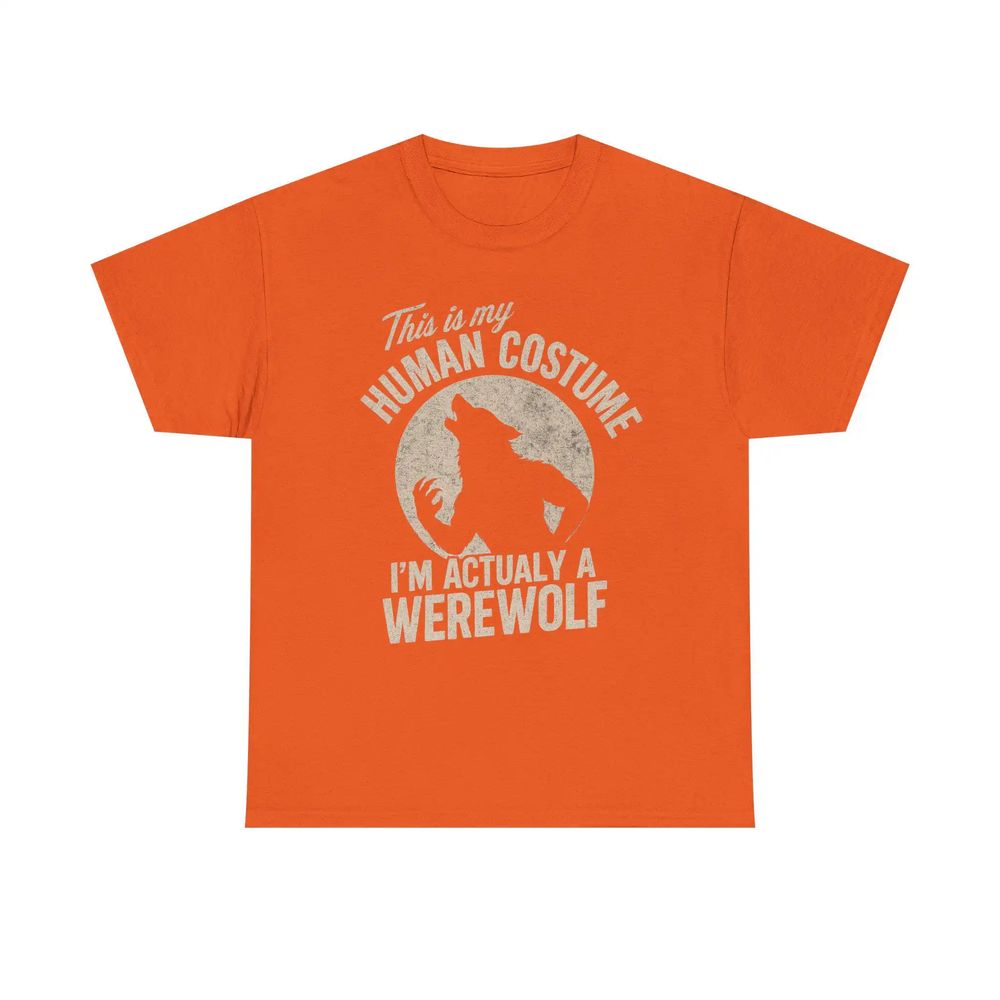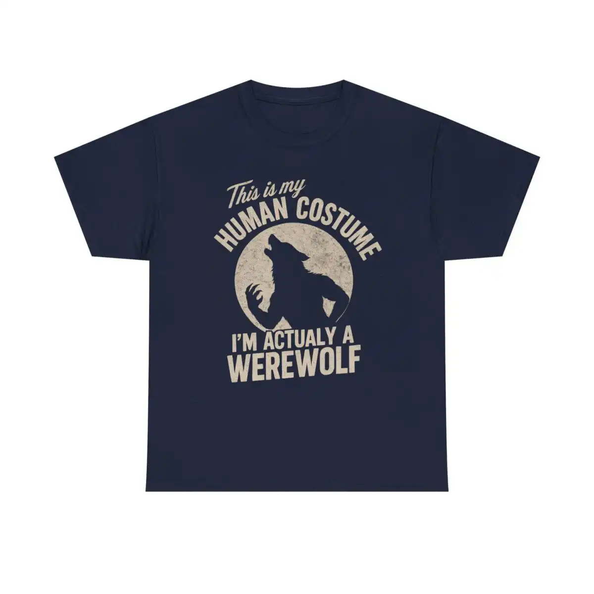 The design features a striking silhouette of a howling wolf against a full moon, instantly evoking that spooky Halloween vibe. The playful phrase, “This Is My Human Costume — I’m Actually a Werewolf,” adds a witty twist that will surely get laughs at any gathering. Moreover, its unisex fit ensures that everyone can enjoy this stylish piece, making it versatile for all occasions.