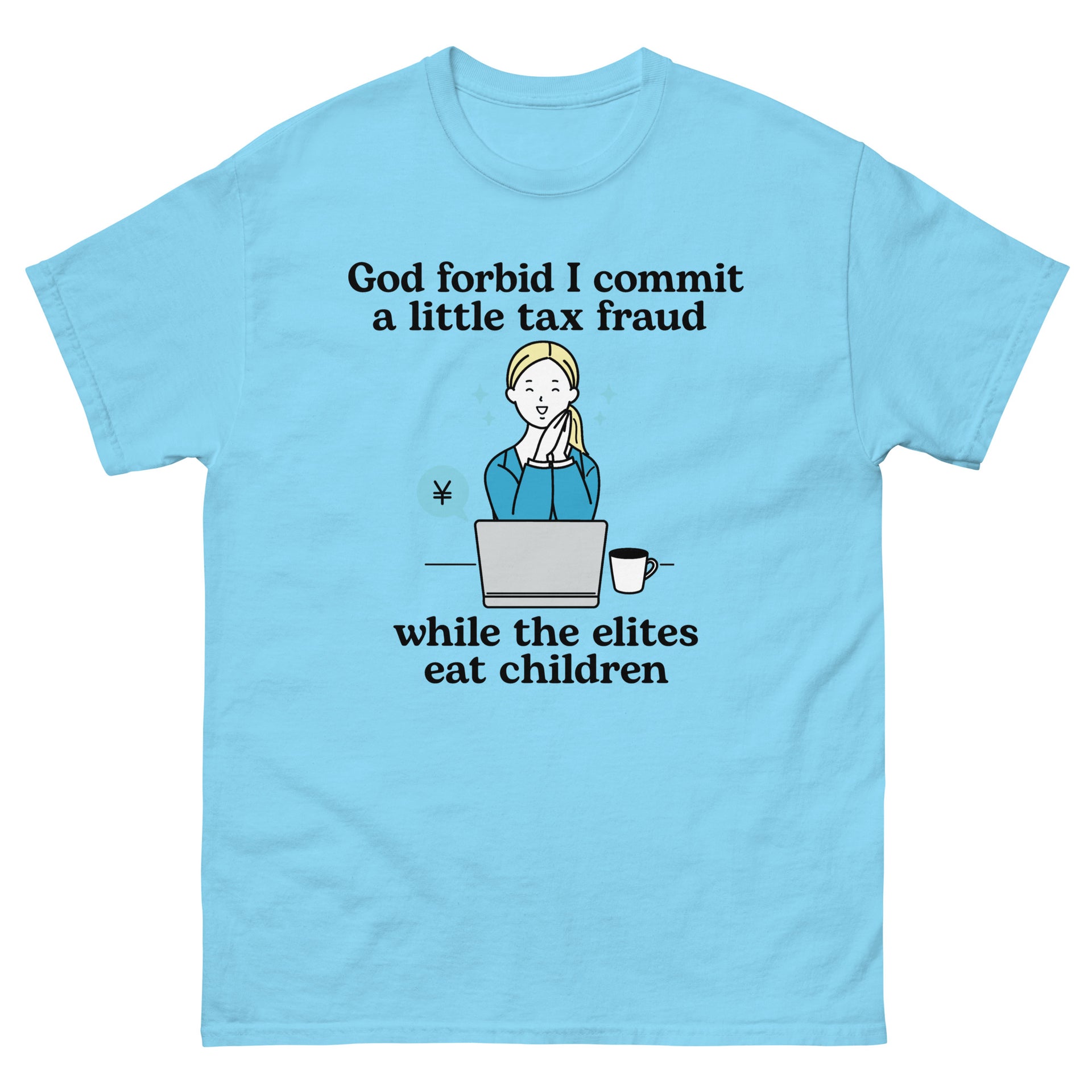 This is a novelty graphic t-shirt that reads “God Forbid I Commit A Little Tax Fraud While The Elites Eat Children.” It directly references and satirizes the online “elites eat children” conspiracy language while framing a darkly humorous, ironic jab at wealth and power. This product is meant as satirical apparel for people who follow and mock modern internet conspiracies and anti-elite meme culture.