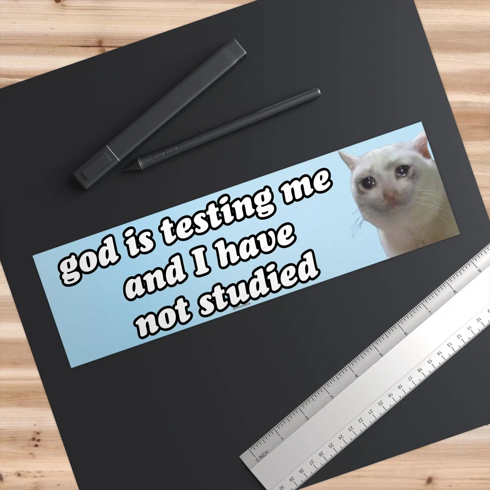 Introducing the God is testing me and I have not studied | Bumper Sticker AND Magnet | Funny Meme Sticker | 8.7” X 2.7” | Waterproof Premium Quality, a playful and bold addition to your personal collection! This unique sticker combines humor with high-quality materials, making it a must-have for anyone who loves to express themselves with a dash of fun.