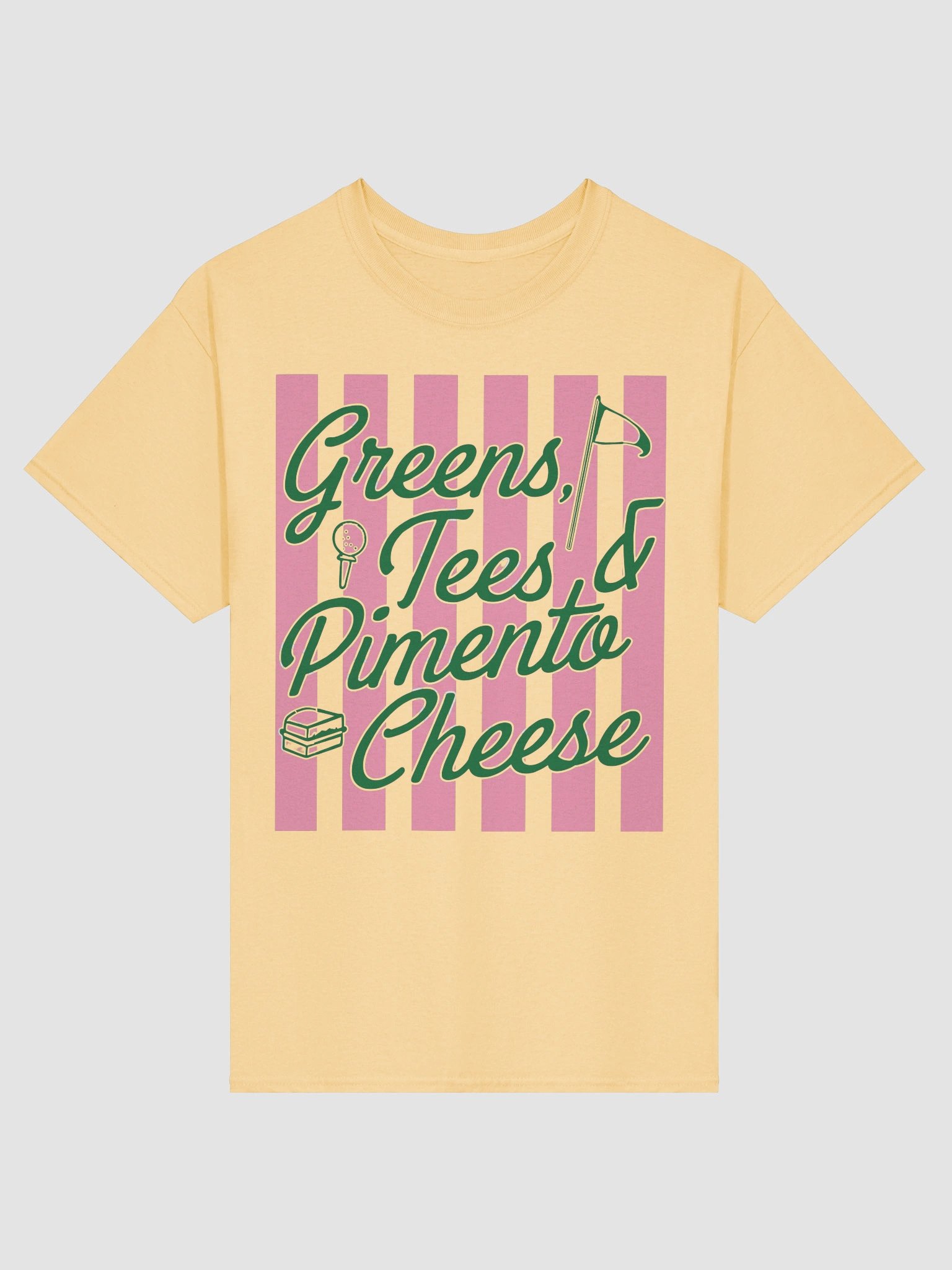 The Greens, Tees & Pimento Cheese T-Shirt is a women’s preppy golf tee that nods to Southern golf week traditions. This Masters-inspired tee combines golf language—”greens” and “tees”—with pimento cheese, the classic Southern clubhouse snack and a playful symbol of Augusta-week culture.