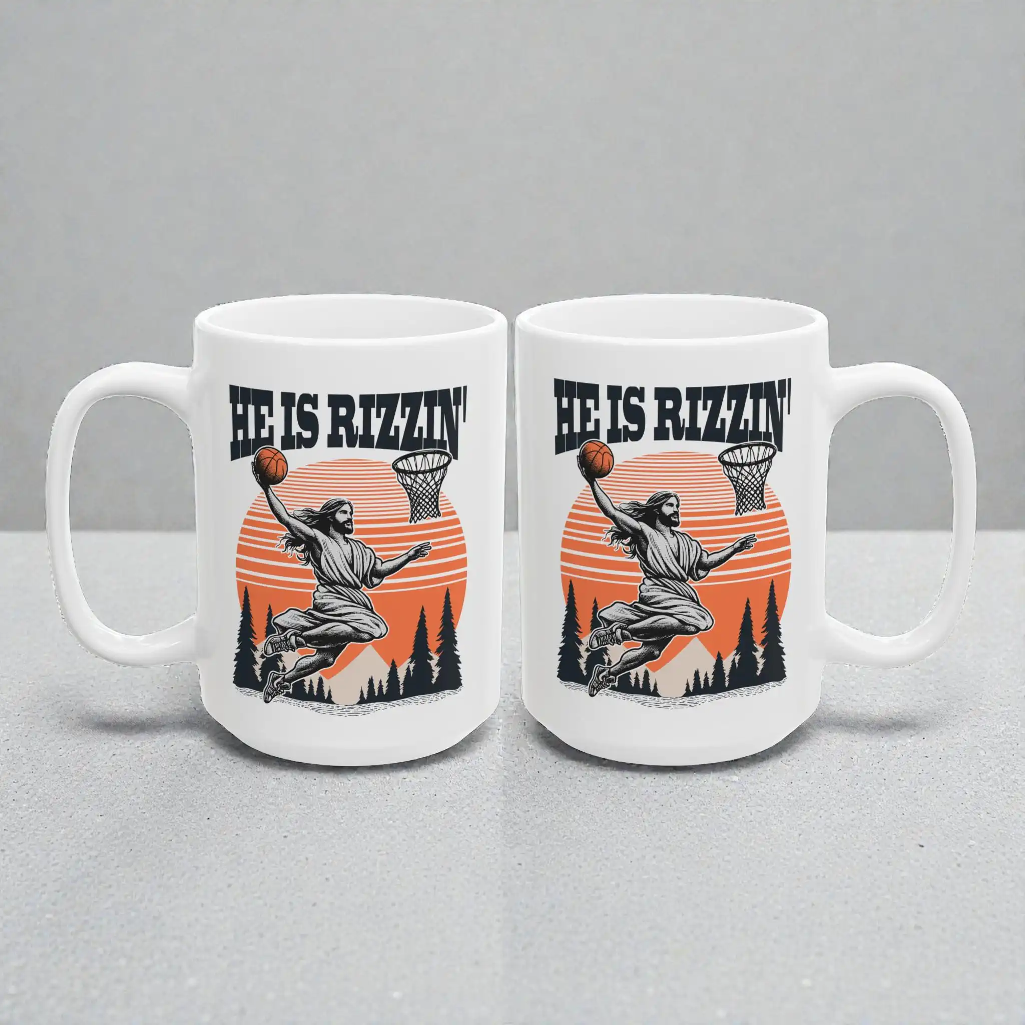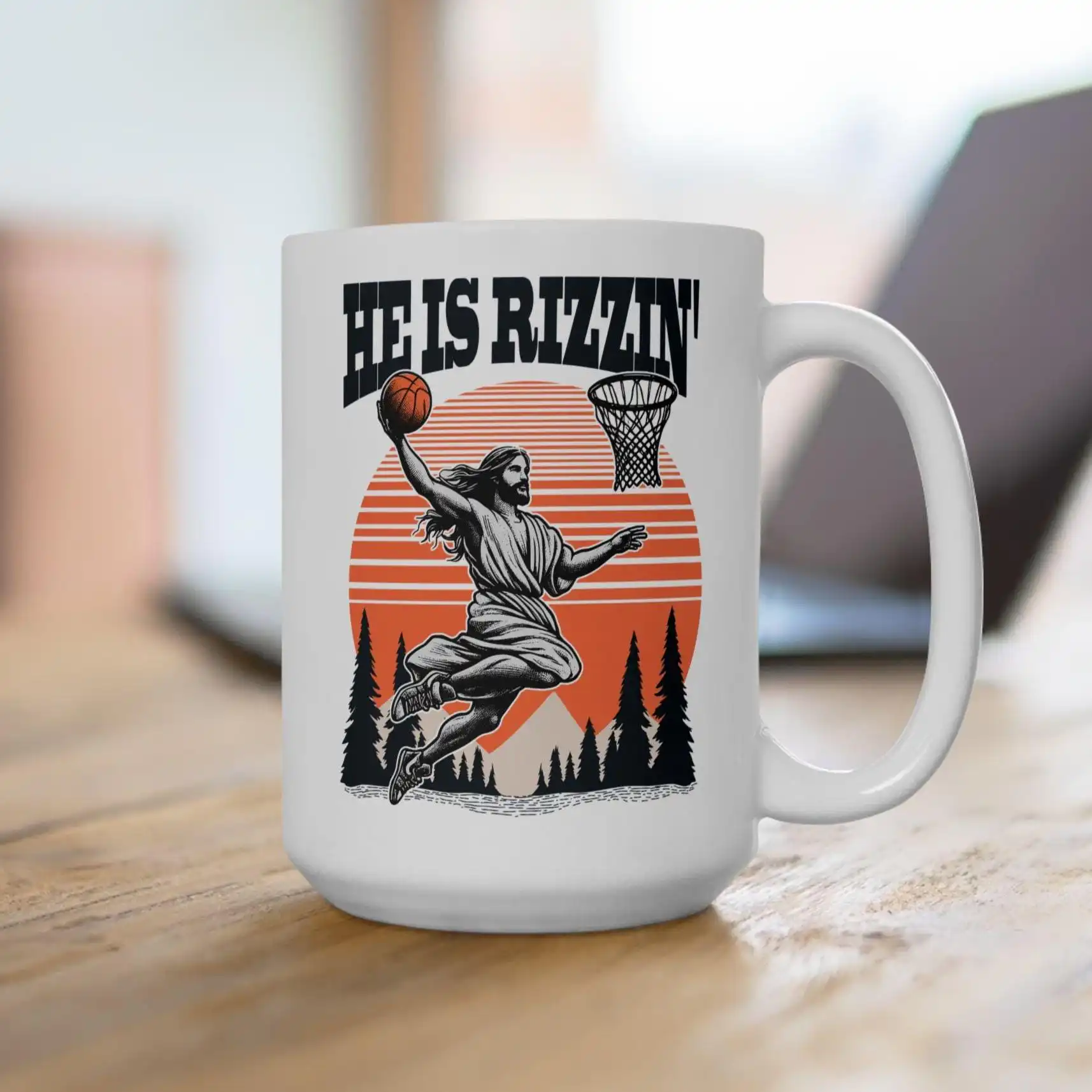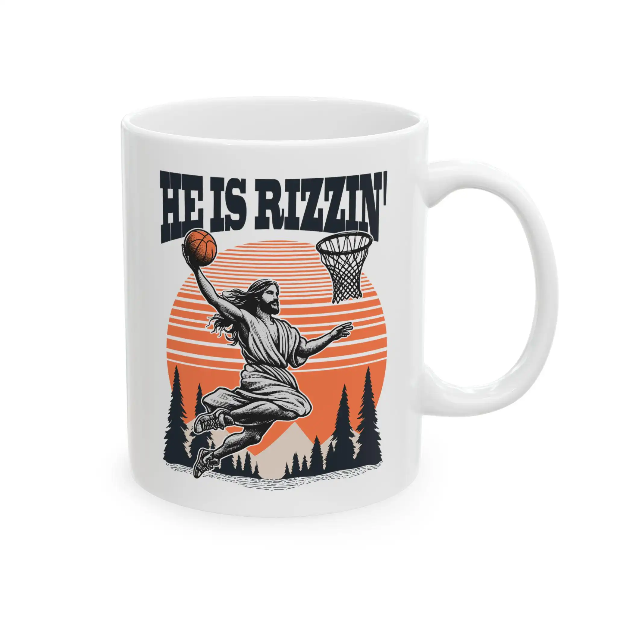 He Is Rizzin Jesus Playing Basketball Mug – Fun Holiday Gift