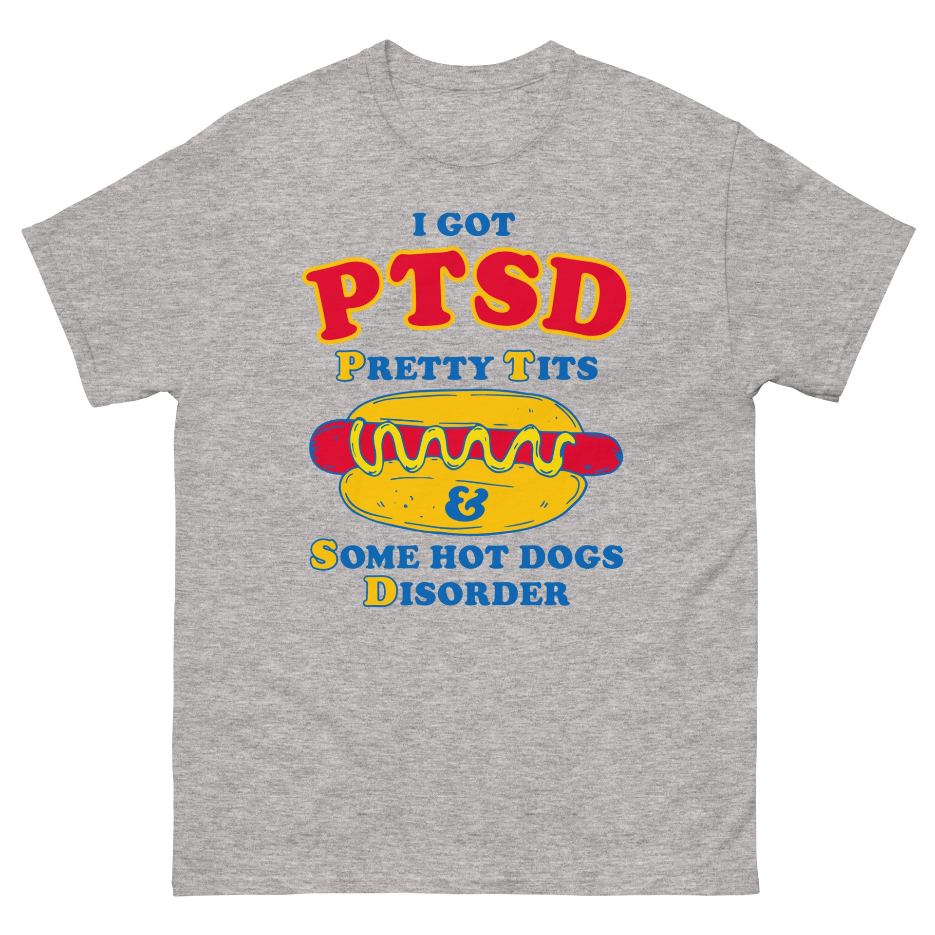 This is a novelty graphic t-shirt printed with the phrase “I Got PTSD Pretty Tits & Some Hot Dogs Disorder.” It references a recent wave of absurdist internet humor where people joke about being comically “traumatized” by bizarre, unexpected combinations of images or moments.