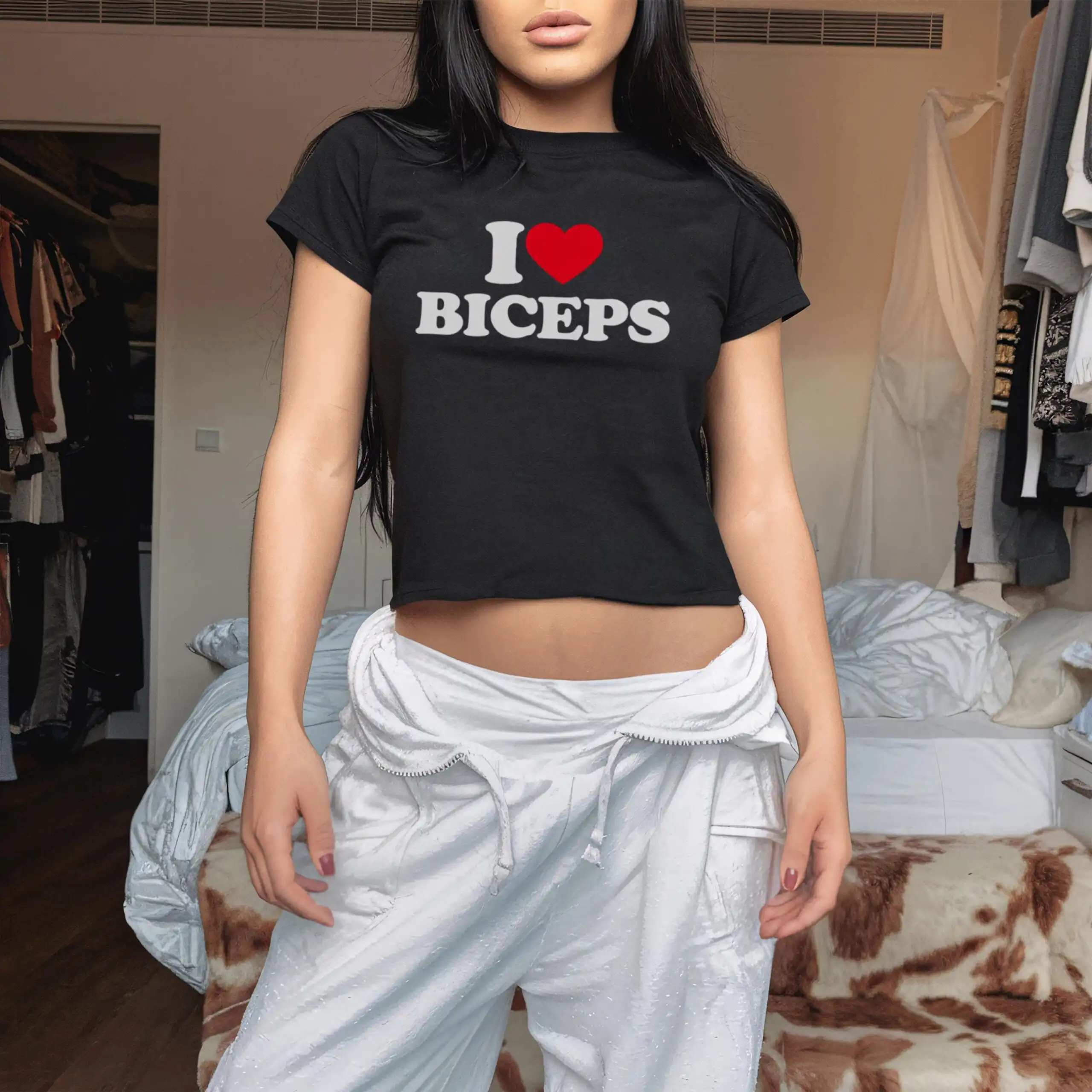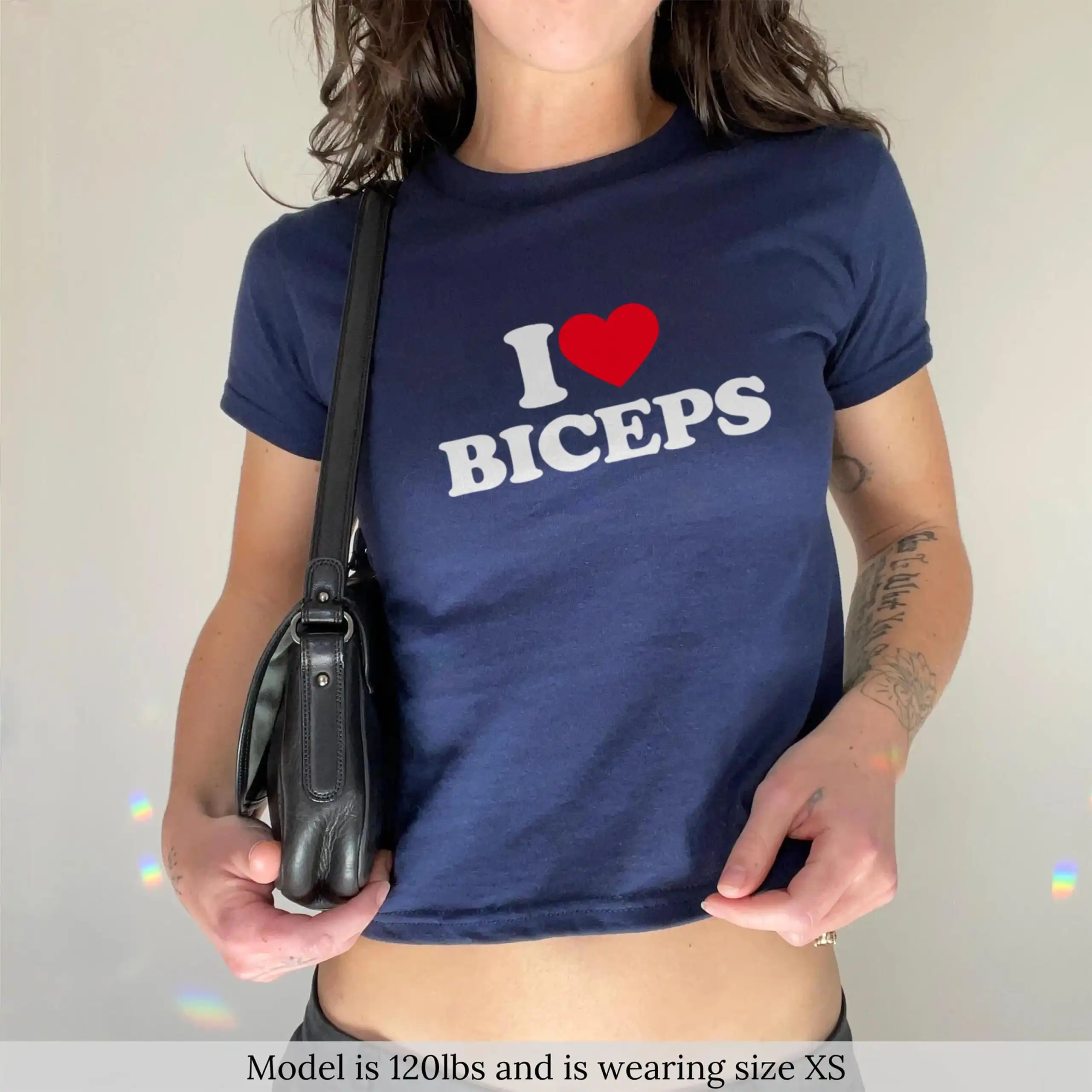 Wear it solo for a bold statement or layer it under a jacket for a more polished look. The I Love Biceps Baby Tee is versatile enough to be a staple in your wardrobe, effortlessly transitioning from workout sessions to social gatherings.