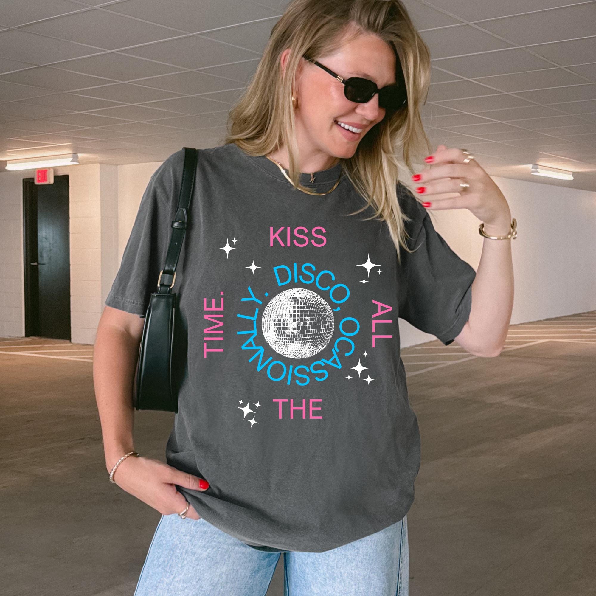 Experience the joy of wearing the Kiss Disco Ball Shirt | Retro Style Graphic Tee, where comfort meets style in a playful, nostalgic design.