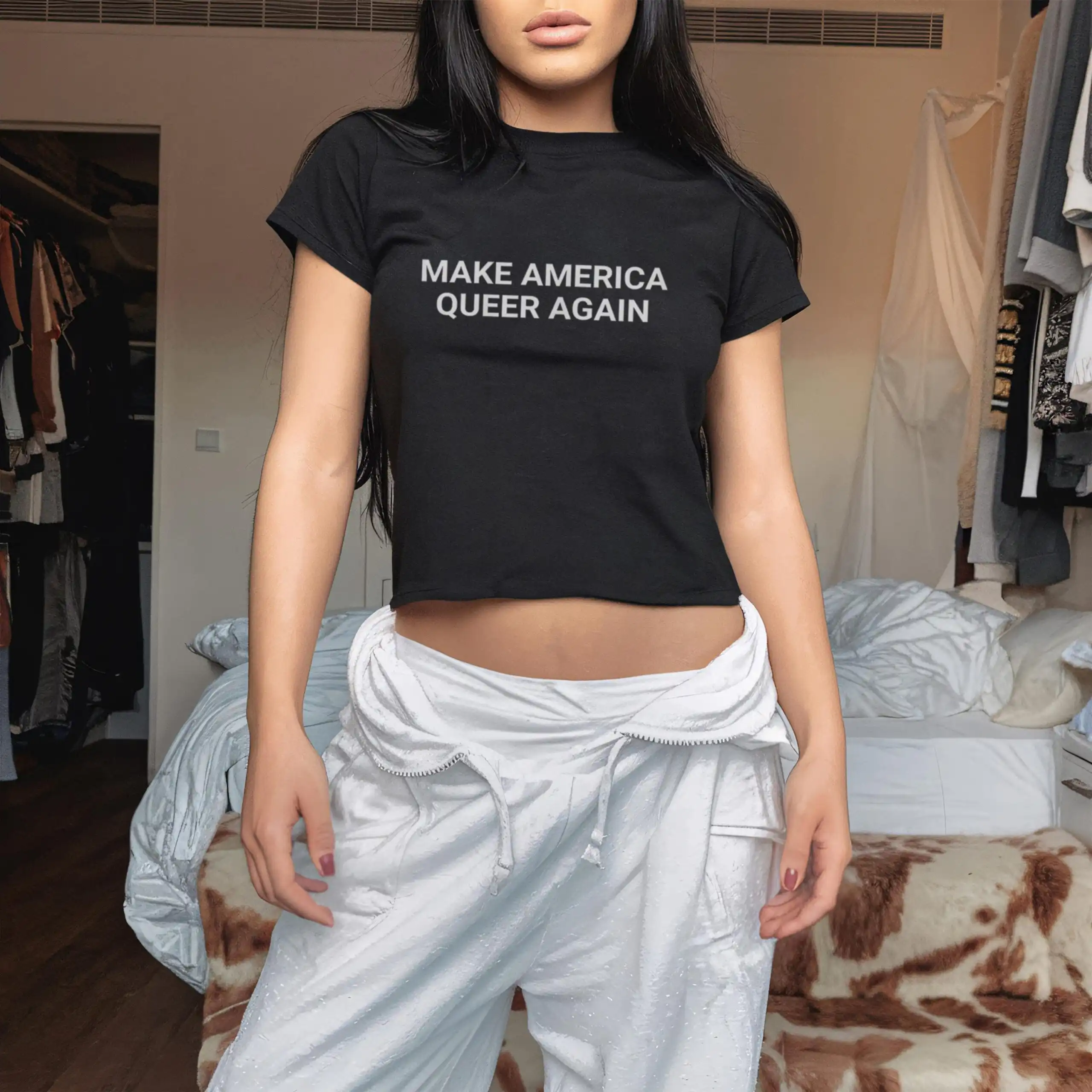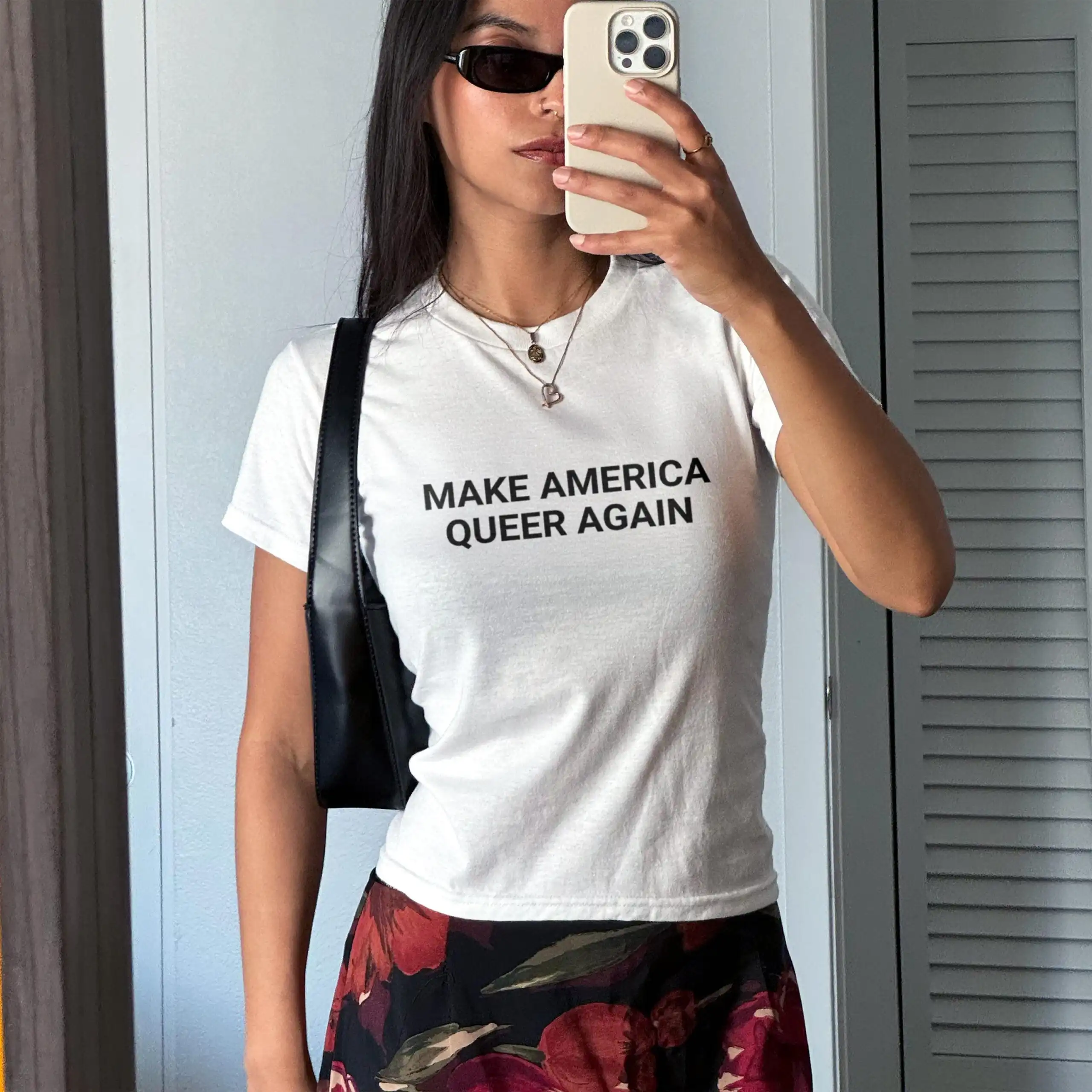 Introducing the Make America Queer Again Baby Tee, a hilarious and bold statement piece perfect for anyone who values LGBTQ pride and wants to make a statement. This Funny Political LGBTQ Pride Shirt blends retro Y2K vibes with a contemporary twist, making it an essential graphic tee for women who advocate for queer rights.