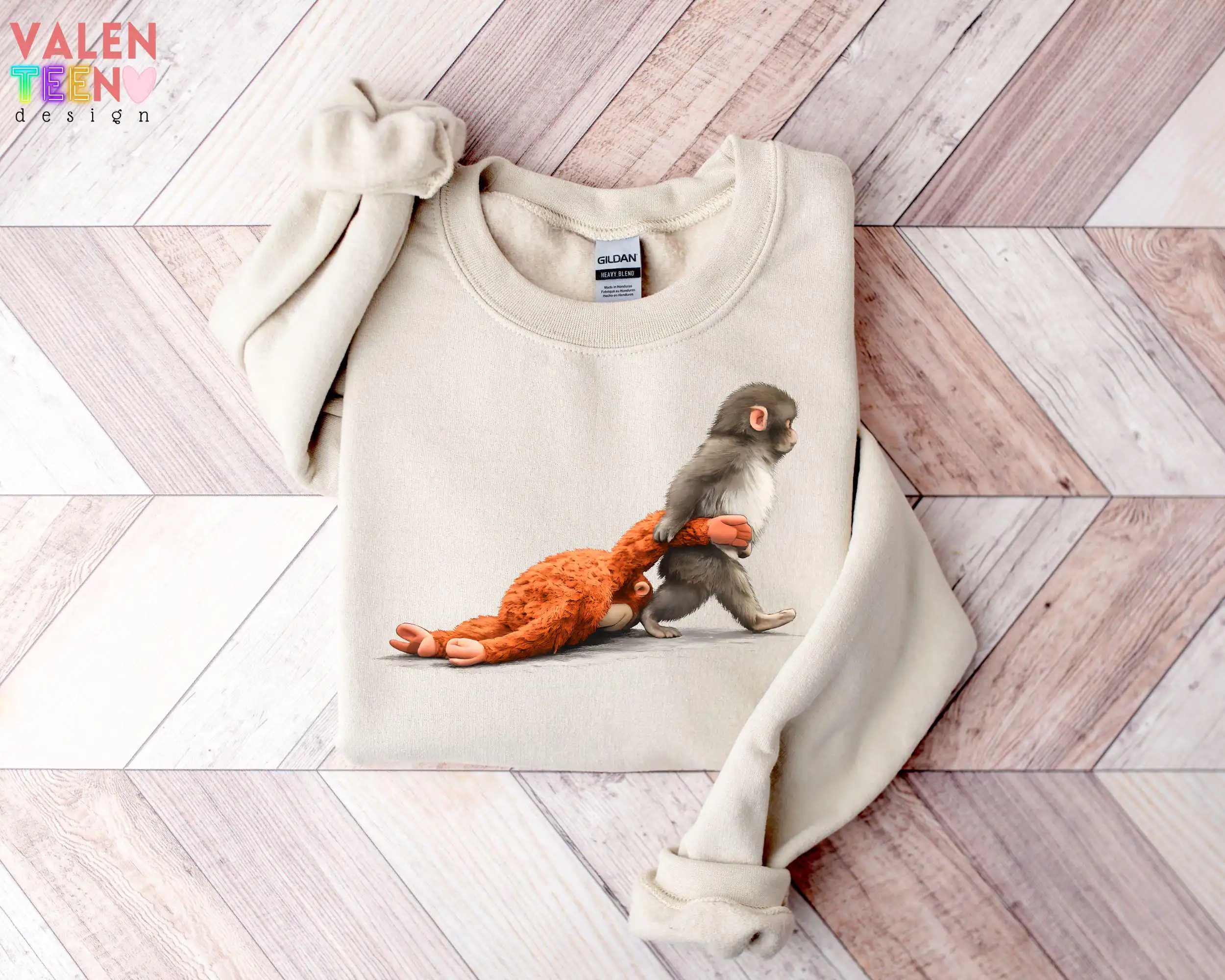 This delightful sweatshirt features an adorable baby monkey gripping a plush toy, adding a whimsical touch to your outfit. The vibrant graphic is designed to capture attention while keeping you in the spotlight wherever you go. Also, it’s made from high-quality fabric that feels soft against your skin, ensuring maximum comfort whether you’re lounging at home or out on a casual outing.