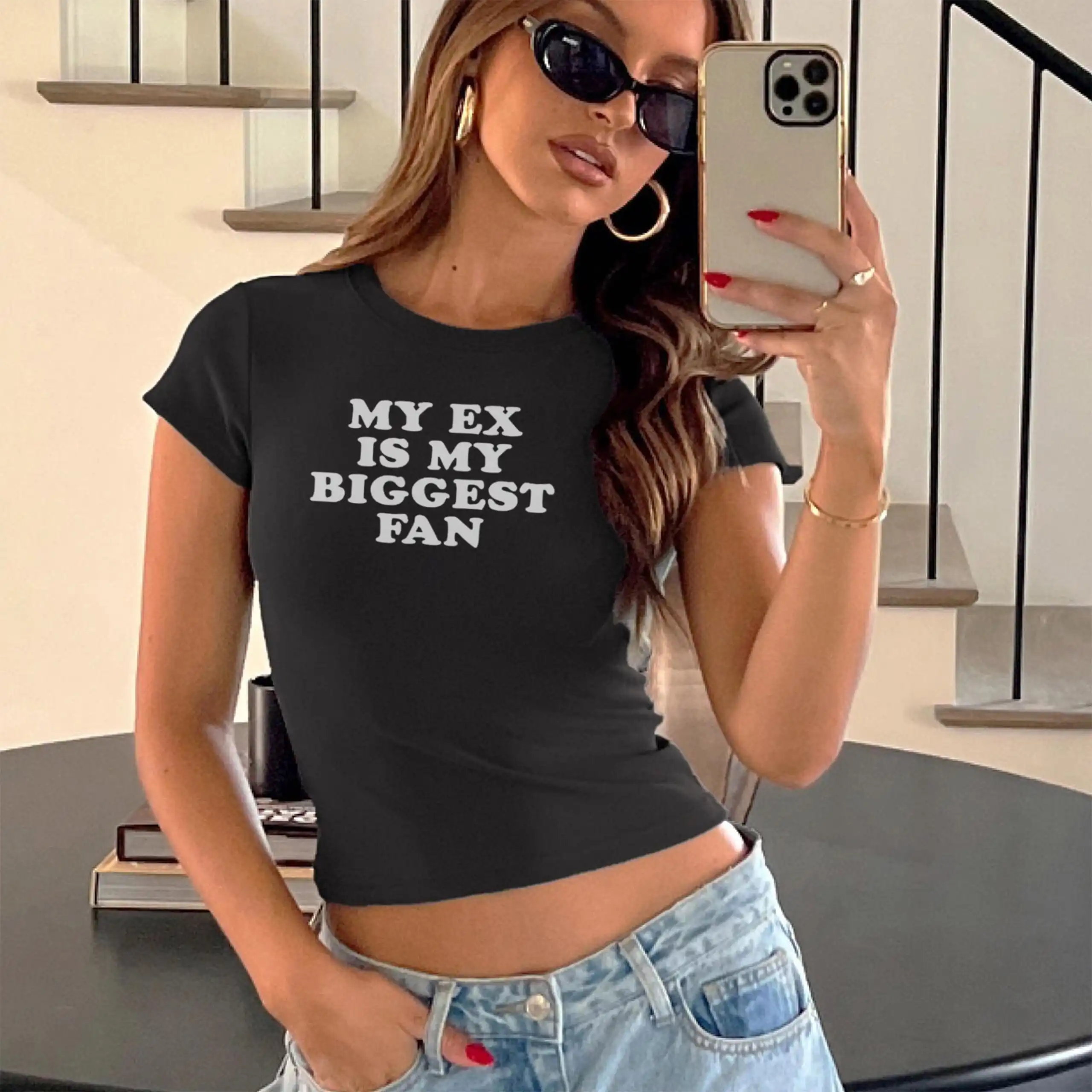 Introducing the My Ex Is My Biggest Fan Baby Tee, a Funny Sarcastic Crop Top that perfectly embodies the playful Y2K Aesthetic. This Trending TikTok Quote Tee is not just a shirt; it’s a bold statement piece for the confident girl who knows how to embrace her individuality!