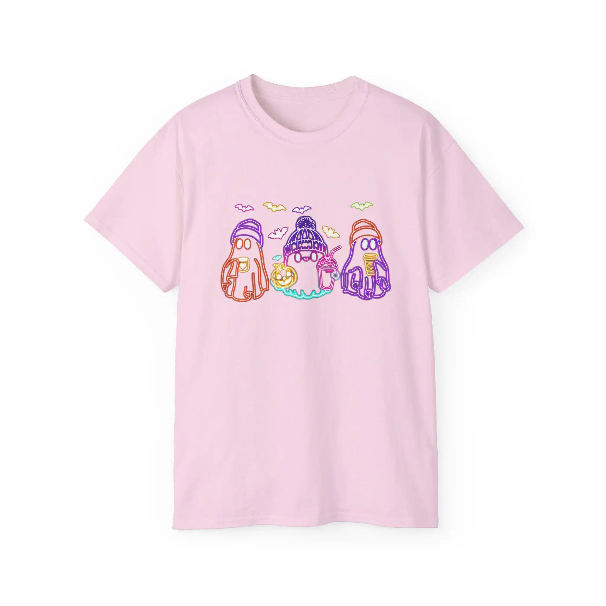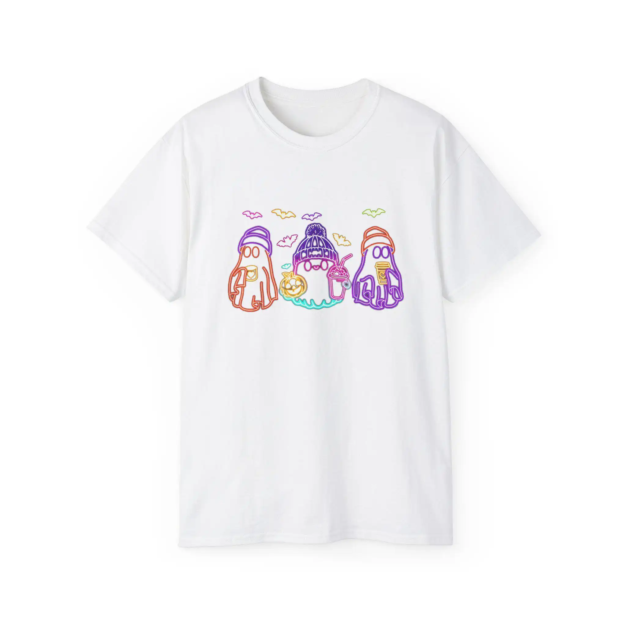 The design features three adorable ghosts, each dressed in cozy hats and sipping on seasonal beverages. With their glowing presence, these ghosts radiate Halloween charm, making this shirt a delightful addition to any fall outfit. Surrounded by neon bats, the graphic offers a playful nod to the spookiness of the season while remaining irresistibly cute.