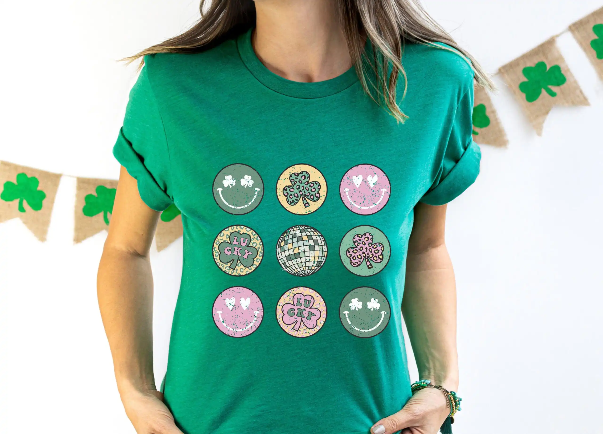 - Fun graphic: eye-catching smiley clover design perfect for any St. Patrick’s Day celebration.