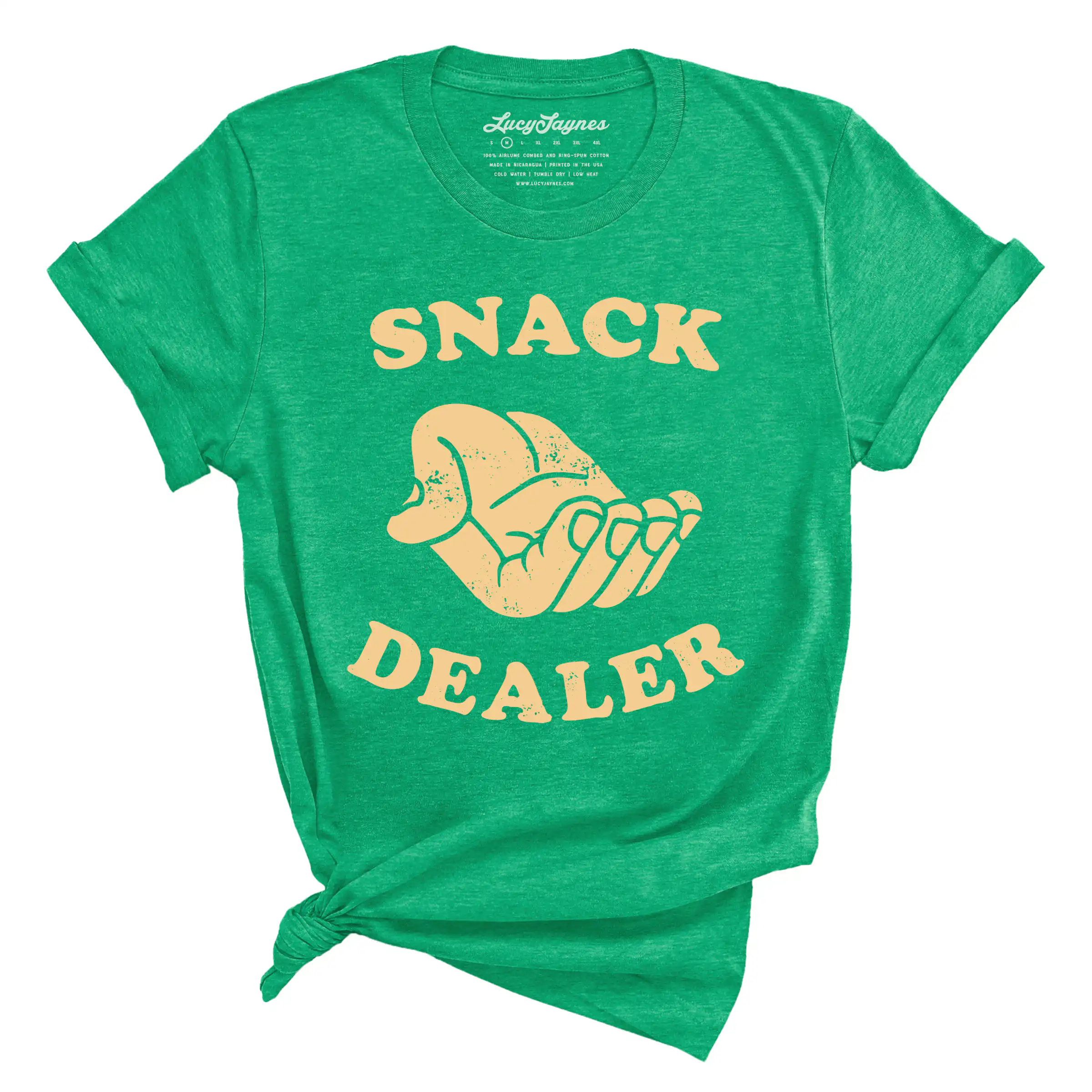 The Snack Dealer Tee offers a relaxed, unisex fit that suits all body types. Made from super soft 100% Airlume ring-spun combed cotton, this tee is designed for comfort. If you prefer a blend, we also have heather styles that feature a 52/48 cotton/poly blend for added durability. Therefore, you can feel good wearing it all day long.