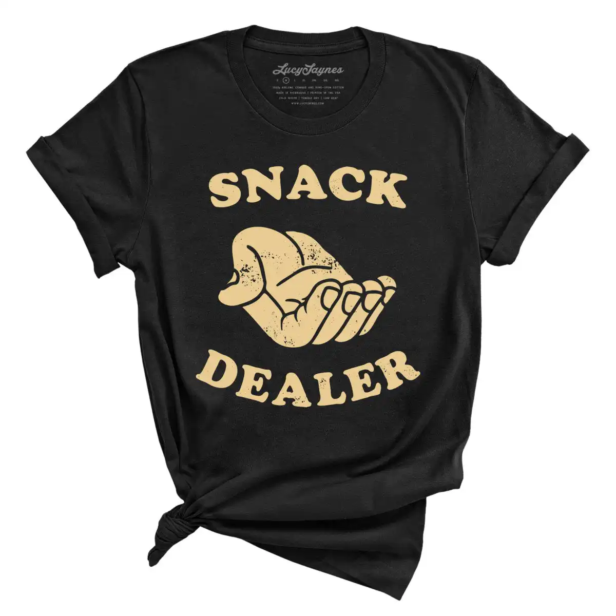 Featuring a golden-yellow distressed illustration of a hand offering a snack, this tee embodies the playful spirit of snack time. The bold retro text reading “Snack Dealer” captures attention and brings a smile to everyone who sees it. It’s a perfect choice for those who embrace fun and creativity in their everyday lives. Moreover, the design resonates with both kids and adults, making it a versatile addition to any wardrobe.