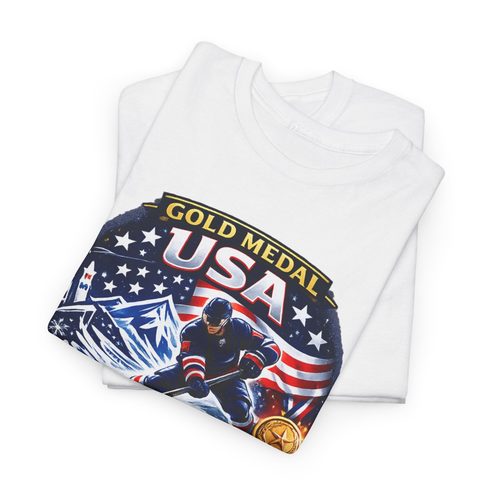 The design of this commemorative tee captures the spirit of the USA Men’s Hockey team’s gold medal triumph. Adorned with a striking red, white, and blue emblem, it features a dynamic graphic of a male hockey player alongside patriotic stars and stripes. The prominent gold medal design symbolizes the glory of their championship victory in Italy, making it a must-have for any sports enthusiast.
