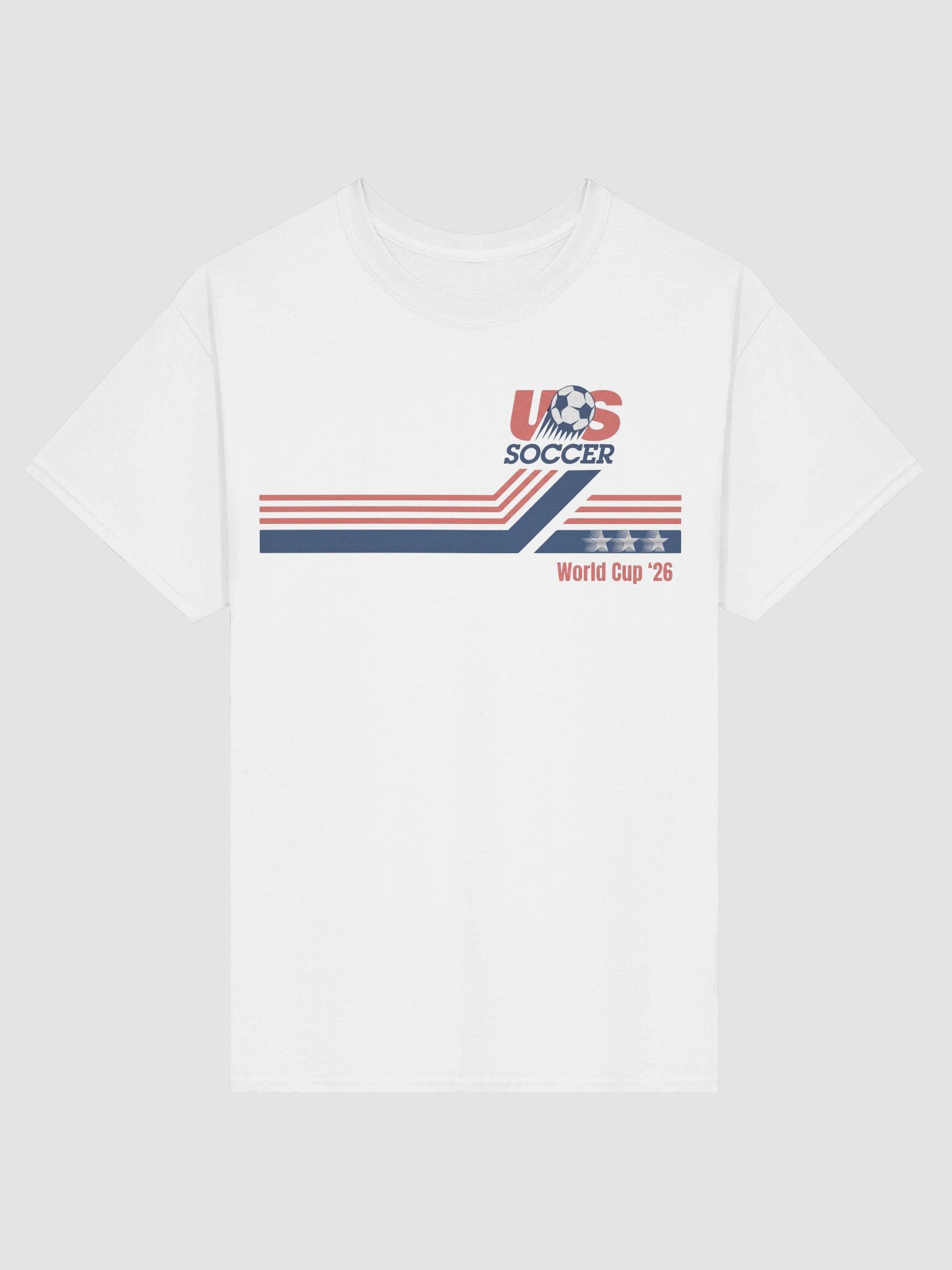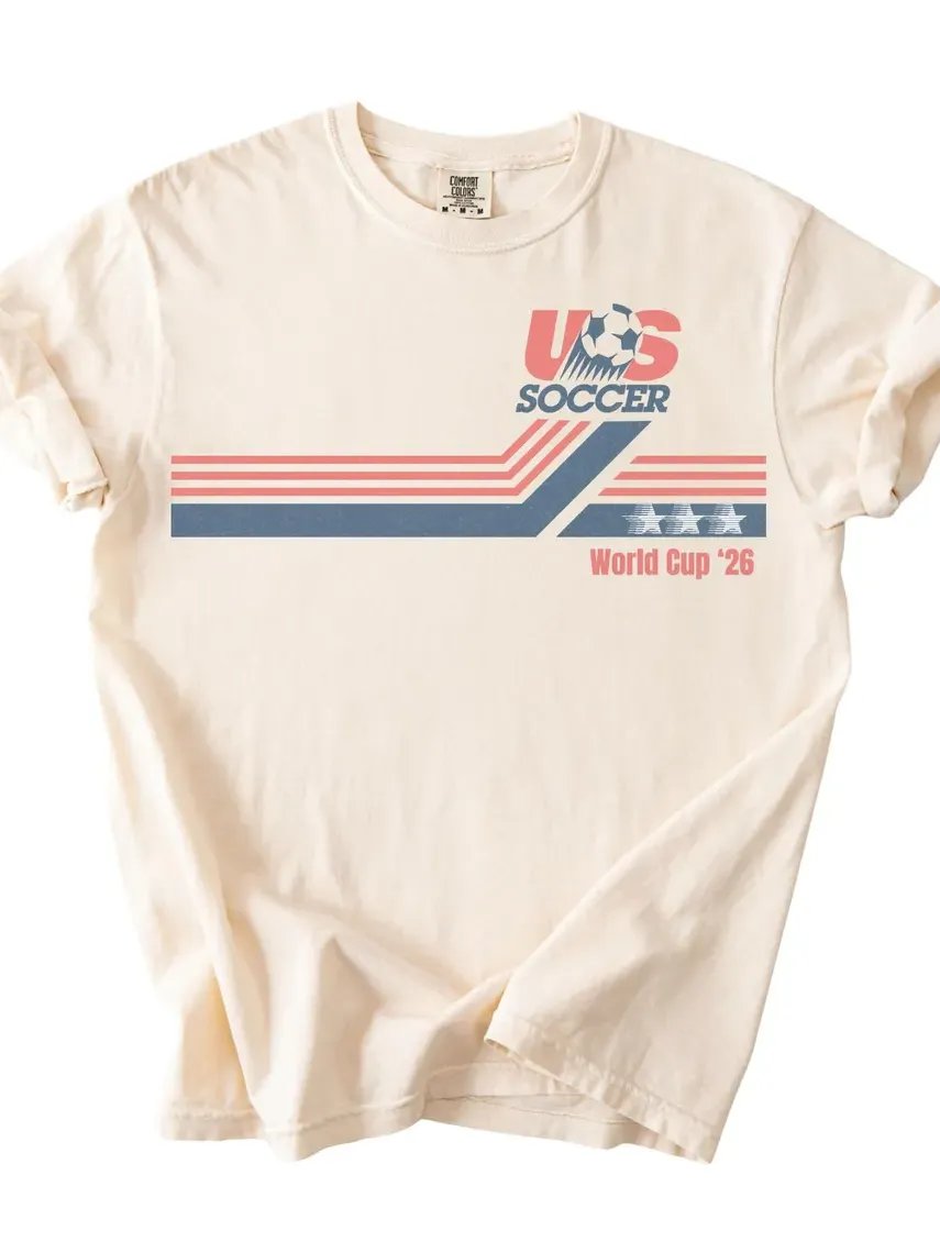 This tee taps into the growing momentum around the US role in the 2026 tournament. Fans are already planning travel, watch parties, and local supporter events as the tournament approaches. The design channels a vintage sports aesthetic that matches the current trend for retro soccer shirts, while nodding to a major moment in North American soccer history: the first World Cup held on this scale across three countries.