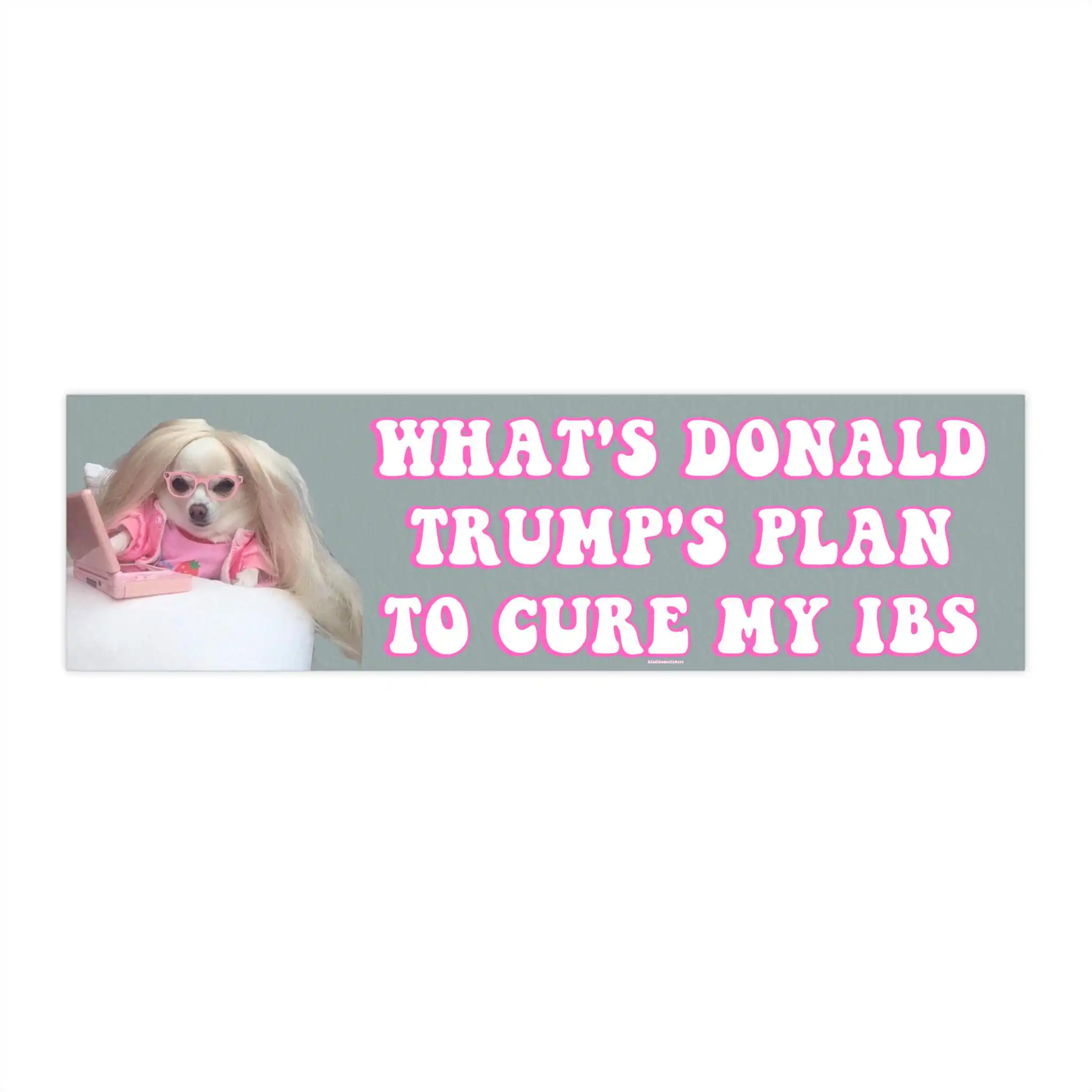 Add a touch of humor to your space with the “What’s Donald Trump’s Plan to Cure my IBS” Bumper Sticker and Magnet! Measuring 8.7” x 2.7”, this waterproof, funny meme sticker is perfect for your car, laptop, or home. Plus, it features vibrant colors and a durable design that lasts for years. Whether you’re a meme lover or just want to share a laugh, this quirky combo is sure to brighten anyone’s day!
