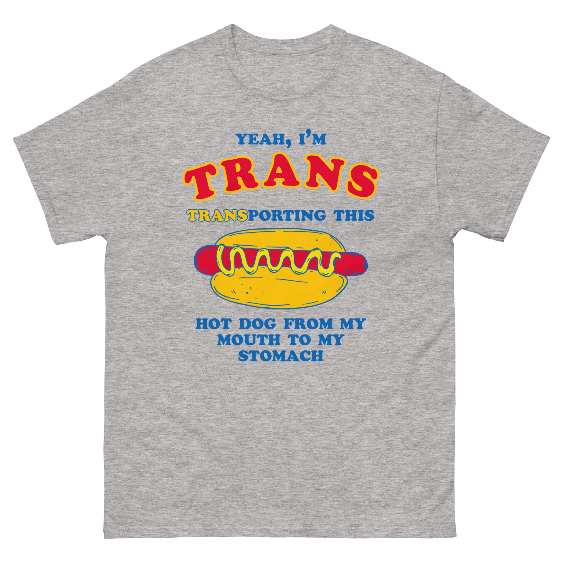 This is a graphic t-shirt that reads “Yeah, I’m Trans, Transporting This Hot Dog From My Mouth To My Stomach.” It references a recent, deadpan style of trans-positive internet humor that pairs identity with everyday actions. The shirt uses blunt, absurdist wording to normalize trans life through a casual, food-related gag.